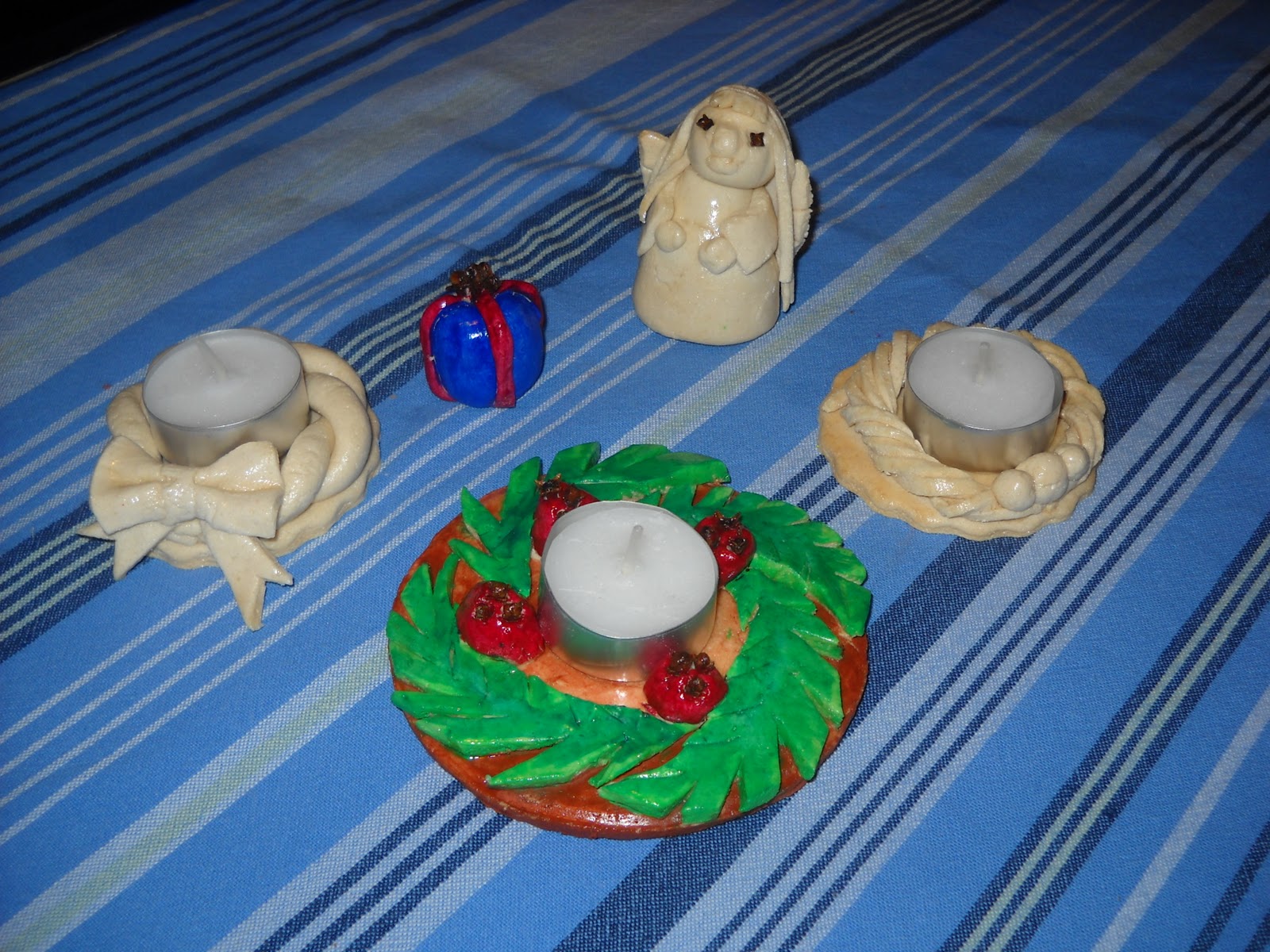 A hozzávalókat összegyúrtam és fél óráig, konyharuhával letakarva pihentettem. A lányok nagyon élvezték a közös játékot és elnosztalgiáztunk a formázás közben. Készültek mécses tartók, hóemberek, angyalka, újévi malac. A tepsibe sütőpapírt tettem és 1 óráig nyitott sütőajtónál 1-es fokozaton szárítottam, majd rácsuktam az ajtót és folyamatosan figyeltem, hogy mennyire szárad, illetve pirul. Régen csináltam már, így el is felejtettem, hogy a hóembert nem lett volna szabad egészben betenni, hanem részenként és utólag kellett volna összeragasztgatni, de majd kijavítjuk. Amivel eddig elkészültünk azt megmutatom, a többiről is teszek fel képet, ha majd megszáradtak. A díszítésül használt szegfűszegtől és borstól karácsonyi illat lett idebenn, temperával festettünk, de fahéjjal a tésztát is meg lehet színezni, illetve a sütéssel is el lehet érni a barna különböző árnyalatait. A lakkozást már a garázsban csináltam.